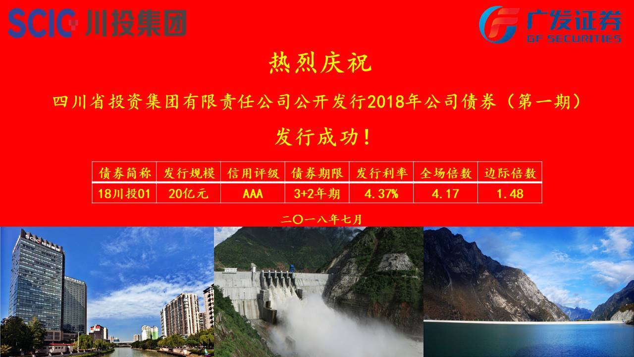 川投集团2018年公司债券(第一期)于2018年7月24日成功在上海证券交易所发行,发行规模20亿元,债券期限3+2年,发行利率4.37%,全场认购倍数4.17,发行利率是截止当日2018年公司债券3+2年期全国第二低。本期债券的高质量发行是川投集团贯彻落实省委、省政府和省国资委高质量发展要求,在资本市场直接融资的成功实践。