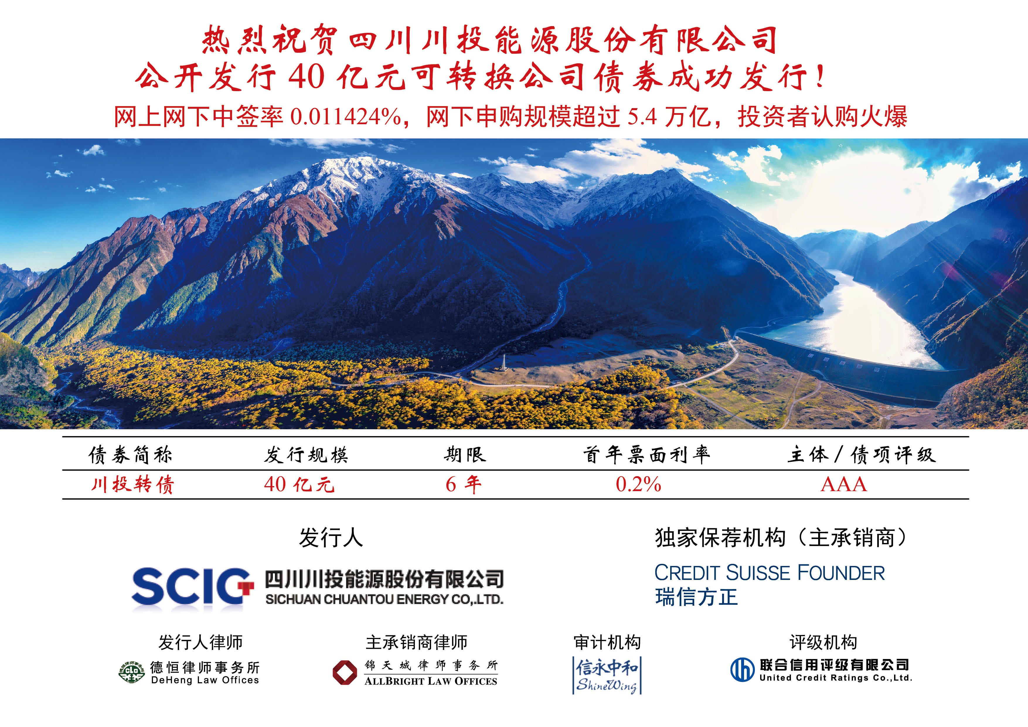 11月15日,川投能源(600674.SH)公开发行A股40亿元可转换公司债券工作取得圆满成功!40亿元募集资金已全额到账!