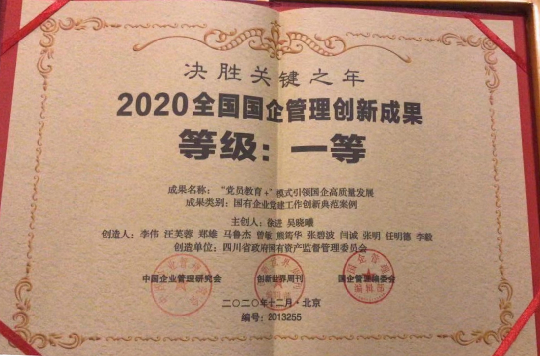 12月19日,2020(第五届)国企管理年会暨全国国企管理创新成果发布仪式在北京召开,由省国资委党委牵头,川投集团党委主要参与创作,以嘉阳煤矿弘扬“燃烧精神”激发党建经验融合发展新活力为主体的《“党员教育+”模式引领国企高质量发展》创新成果,经过层层评选,最终在全国5100多个参赛作品中脱颖而出,荣获全国国企管理创新成果一等奖。