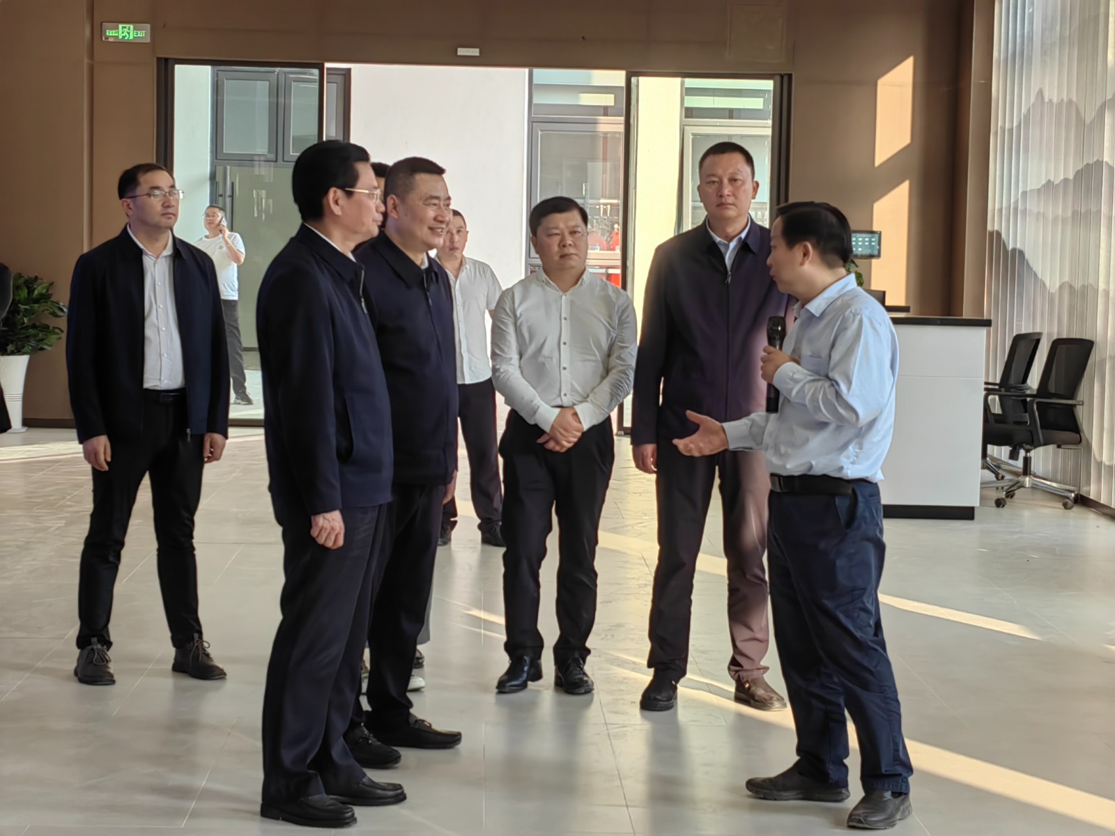 梁红兵向蔡邦银一行详细介绍了资阳燃气电站项目装机规模、燃气发电的生产流程以及投产后的经济和社会效益等情况。