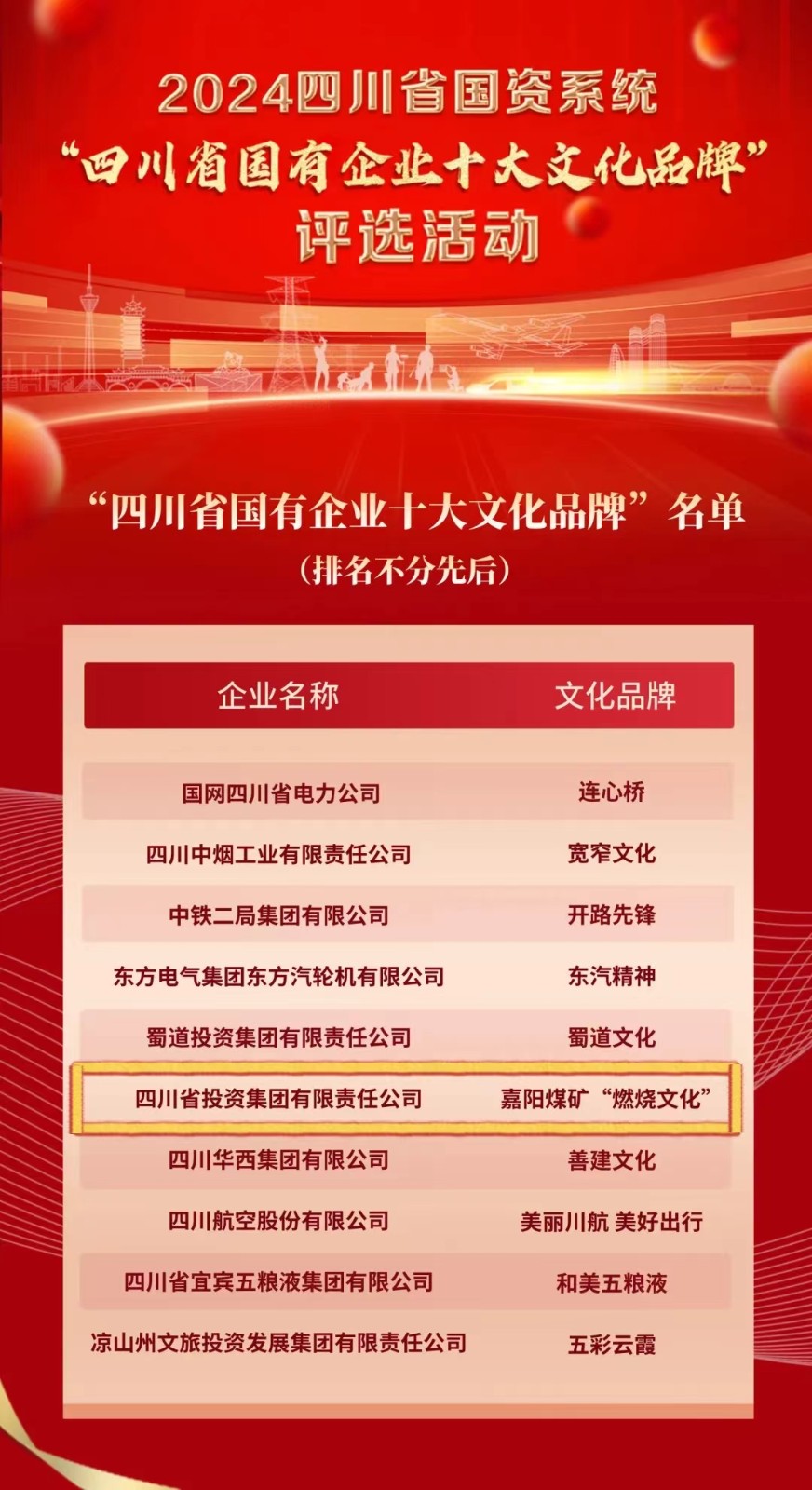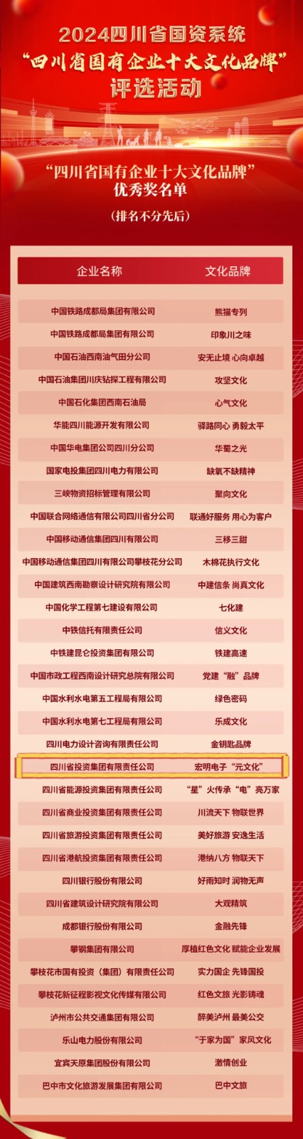 为进一步加强和推动国有企业文化建设,提升品牌传播力,树立国有企业社会良好形象,充分展示国资国企改革发展新进展新成效,省国资委组织开展省国资系统“四川省国有企业十大文化品牌”评选活动。此次评选,总计近60家省(市)属国有企业申报。来自四川省委宣传部、四川大学、央级媒体等各界权威平台的专家,结合网络投票、综合评议等评审体系,评选产生“四川省国有企业十大文化品牌”。