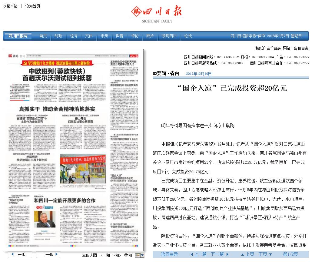 已完成项目主要集中在金融、资源开发、康养旅游、航空运输及通航四个领域。具体来看,四川发展战略入股凉山商行,计划5年内在凉山州投放扶贫信贷余额不低于280亿元;省能投集团投资105亿元扶持美姑等县风电、光伏、水电项目;川投集团投资300亿元打造“西部康养产业扶贫基地”;川航集团增加西昌运力投放,筹建西昌过夜基地,建设通航小镇,打造“飞机+景区+酒店+特产”航空产品。