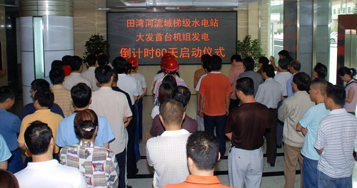 2007年7月27日,公司在办公楼一楼大厅举行了“田湾河梯级水电站大发首台机组发电倒计时60天启动仪式”。仪式由公司党委副书记、纪委书记刘凤鸣主持,公司领导孙志祥、王新、唐剑虹、李昌伟以及参建各方代表共计60余人参加了倒计时启动仪式。