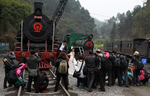 今年春来早,花开正当时。春暖花开之际,嘉阳小火车又迎来了别样的浪漫之旅。3月1日来自成都、宜宾和乐山的78位摄影爱好者和游客坐上了一趟独具特色的婚纱模特摄影专列。嘉阳小火车2013年“花季之旅”也正式拉开序幕。