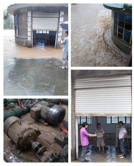 28日凌晨6点,刘家河取水泵房外洪水上水较快,公司负责人接电话后,立即在确保人员安全的基础上,将能够快速转移的取水电机、水泵等相关供水设备进行拆除撤离,放置在安全位置并要求该部门撤离值班人员,在较高位置观察水位。7点半,汹涌的洪水冲进了普安镇刘家河取水泵房,泵房外堡坎坍塌、围墙损毁,泵房内一台110kw和一台55kw电机受损,两台控制机柜也被洪水冲倒,整个取水泵房无法正常运行。29日随着洪水的退去,取水泵房内已经灌满洪水,但因刘家河取水泵房修建时间为上世纪60-70年代,是石头粘砌高度为低于地表面10米左右,属于抗外压性质的泵房,灌满洪水的泵房给周边房屋建筑物带来了极大的安全隐患,为此公司立即调派2台抽水机和购买了一台大型抽水机,及时将洪水排出泵房。此次洪峰虽然造成刘家河泵房淹没,导致两台水泵电机和两组控制柜无法正常使用,但未造成值班人员伤亡事故,同时因为在汛期来临前已经提前与杨家坝水库管理中心联系,保证普安县城供水有充足原水,普安城区自来水供应得到根本上解决。