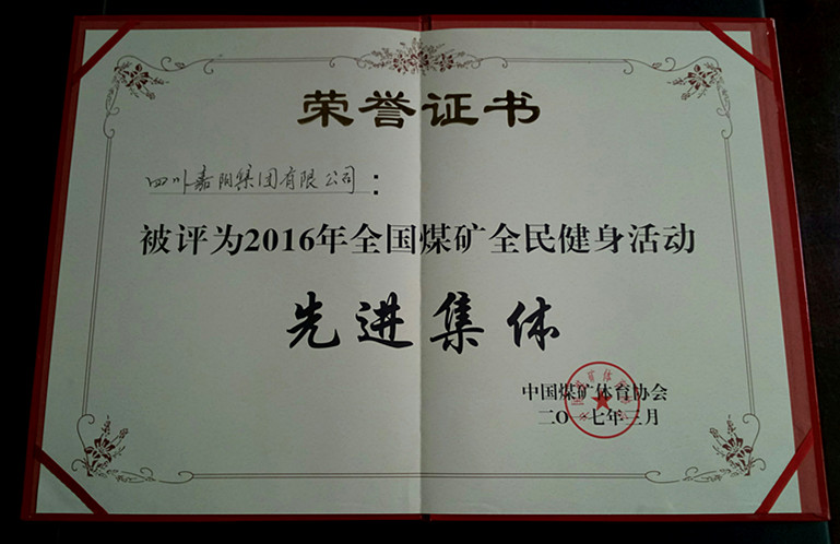 近日,中国煤矿体育协会授予嘉阳集团“2016年全国煤矿全民健身活动先进集体”称号,嘉阳集团常务副总经理刘成希同志被评为“全国煤矿全民健身先进个人”,嘉阳集团也是此次评选中四川省唯一一家受表彰的单位。