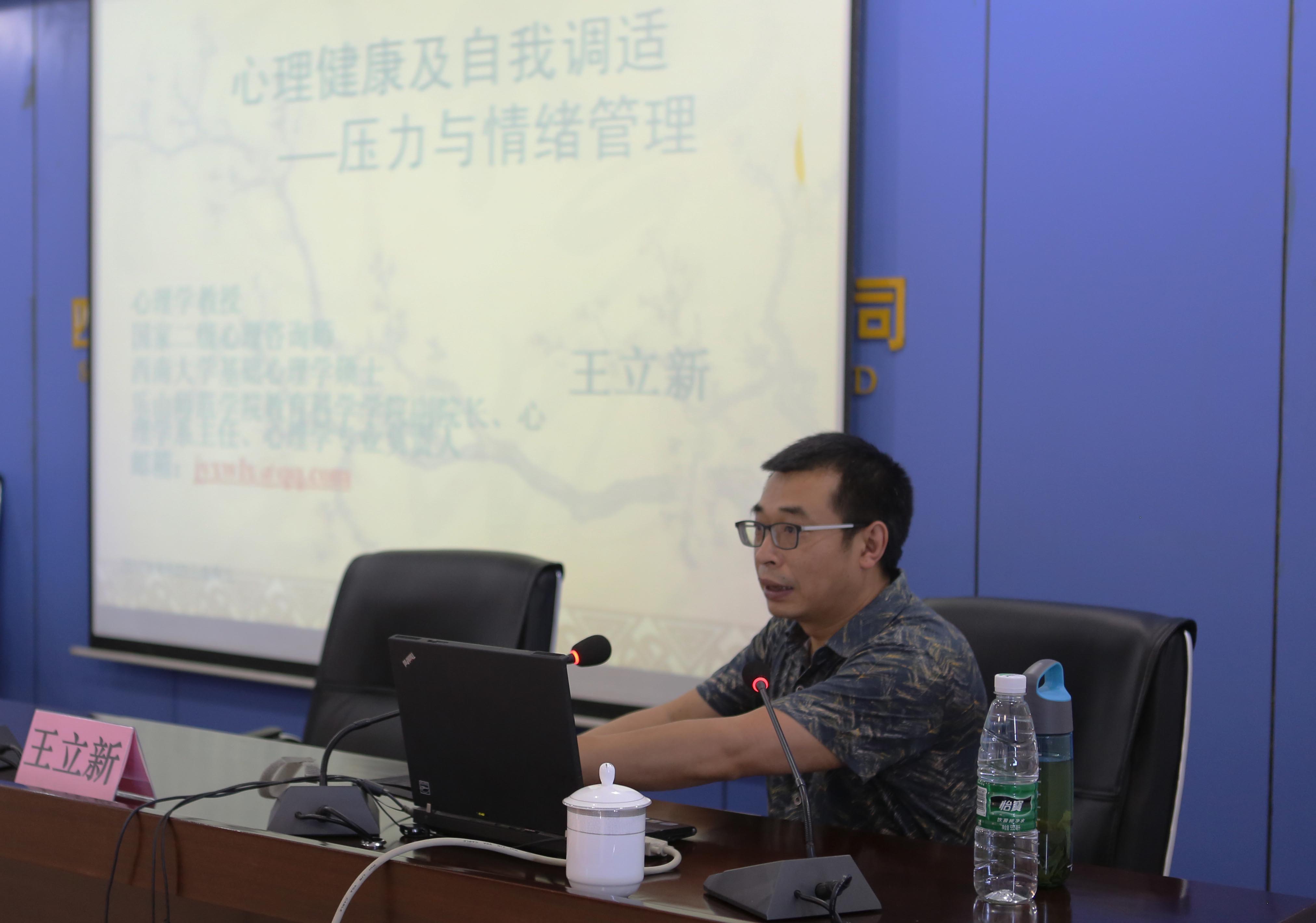 当前,公司针对生产经营管控、改革创新转型压力的日益增大,公司领导高度关注各级各类管理人员身心健康,特聘请了心理学教授、国家二级心理咨询师、西南大学基础心理学硕士、乐山师范学院教育科学学院副院长、心理学系主任、心理学专业负责人王立新亲临公司,为大家讲授心理健康知识。王立新教授生动活泼、幽默风趣的语言、丰富多彩、图文并茂的知识内容,教会大家全面认识情绪及压力,正确运用压力管理策略塑造阳光心态,合理进行心理调适与情绪管理,从而确保身心健康,为公司改革创新、转型发展继续努力奋斗。