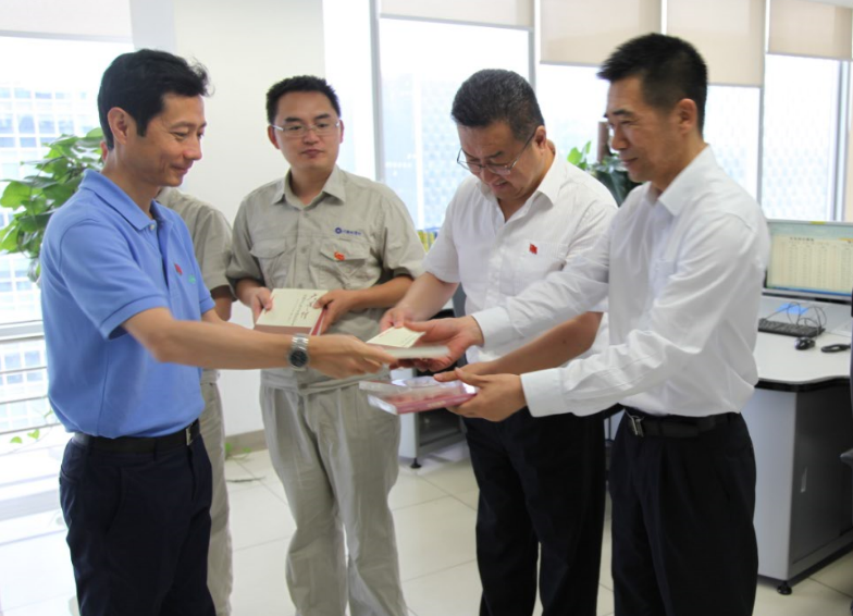 为强化“两学一做”效果,落实“三抓三促”工作要求,强化基层党员、组织“四个意识”,按田湾河公司党委年度工作计划,2017年7月6日下午,田湾河公司党委书记、董事长张昊与党委副书记、纪委书记朱莉来到田湾河公司四支部开展“书记送书下基层”专题活动。田湾河公司纪委委员、四支部书记、发电部副经理郭建平,发电部经理马海军与在岗值守党员参与了本次活动。