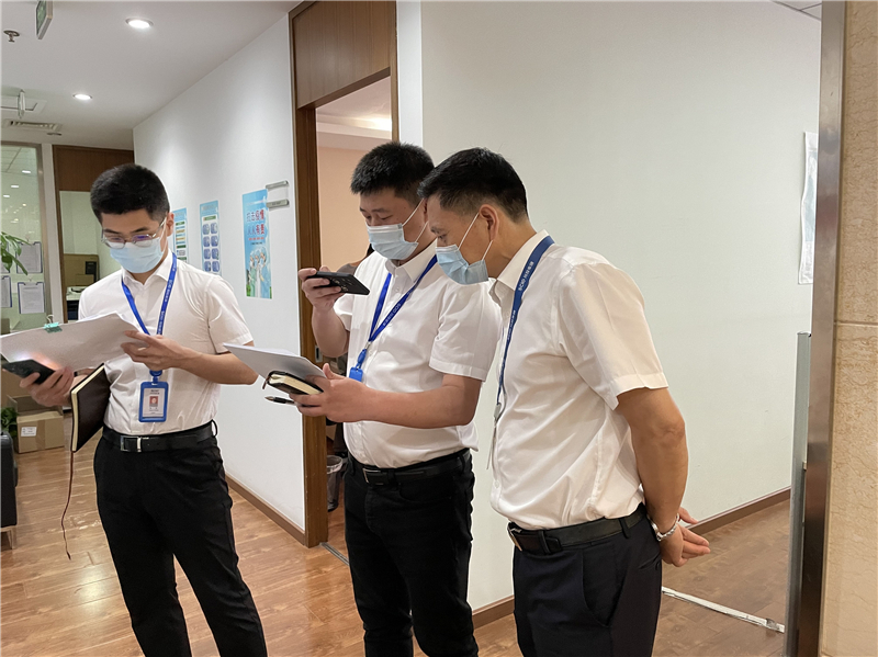 冉兰平一行首先对川投电力的办公区域、公共区域等关键点位进行了检查,并详细查看了防疫物资储备情况、疫情防控工作台账、人员健康登记台账,询问了个别“黄码”人员和“轨迹重叠”人员的核酸检测情况和居家办公情况等。随后,冉兰平一行又采取“扫楼”方式,对川投大厦6楼、9楼各办公室的疫情防控工作落实情况进行逐个督查检查。