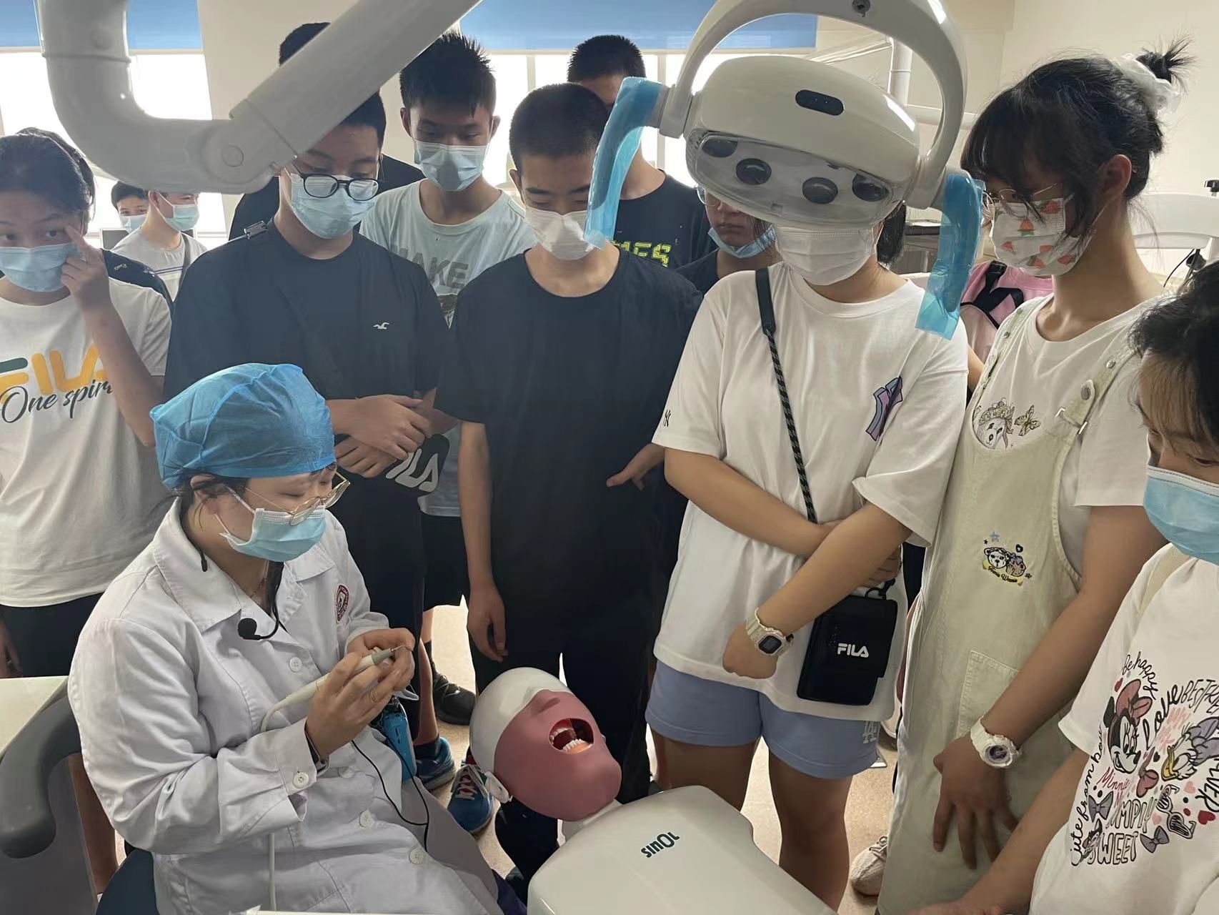 实践环节,儿童口腔科廖医生利君为同学们进行了3D口内扫描操作演示,她通过光学探头对口内软硬组织进行扫描,最终获取口内3D数字化模型,让同学们直观了解自己口内情况。在仿头模室,廖利君通过情景演示,让同学们近距离了解了口腔临床诊疗操作,深度体验口腔医生日常工作。