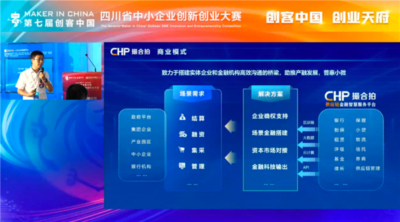 在项目展示中,川投云链领队介绍到:在数字化发展的背景下,川投信产所属川投云链通过区块链、大数据、云计算等数字技术的创新应用,打造“撮合拍供应链金融智慧服务平台”,不断聚合众多银行、小贷等生态伙伴推动供应链金融产品创新,助推企业信用数字化,提高普惠金融践行效率,让数字跑替代企业跑,打通金融机构与企业融资最后一公里。平台已广泛服务于我省装备制造、电子信息、能源化工等产业链,助力企业供应链融资成效凸显,获得政府、客户及业内等多方的一致好评。