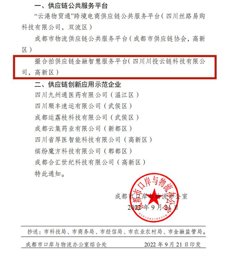 9月21日,成都市口岸与物流办公室发布了关于明确2022年度供应链公共服务平台和供应链创新应用示范企业评选结果的通知。川投信产所属川投云链公司报送的“撮合拍供应链金融智慧服务平台”,在此次评选中正式获得了供应链公共服务平台认定,成为成都市3家获得认定的平台之一。