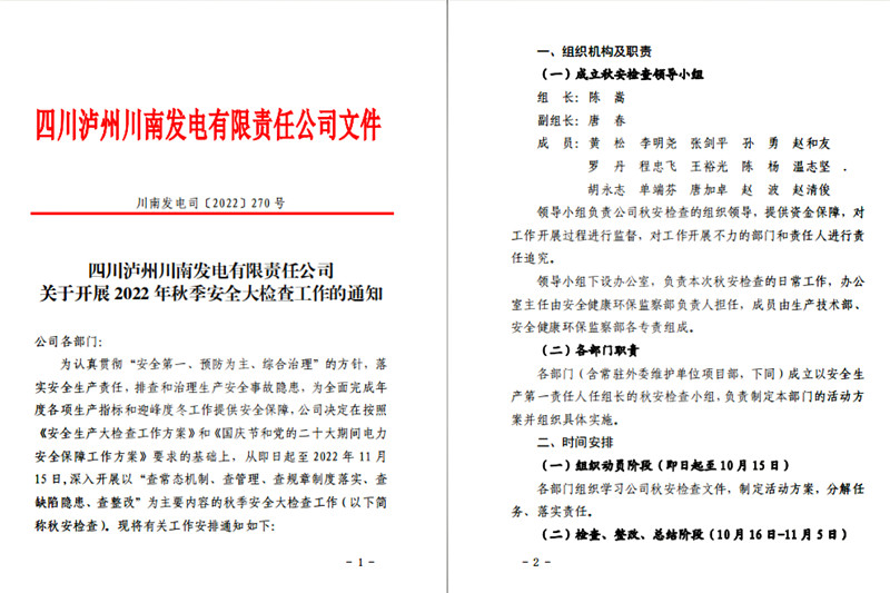 本次秋季安全大检查成立了以公司党委副书记、总经理任组长的领导小组,对活动提供资金保障,对工作开展过程进行监督。活动将在公司范围内对《国庆节和党的二十大期间电力安全保障工作方案》进行再落实,对危险化学品集中治理工作进行阶段总结,进一步深入开展有限空间作业专项整治。在对前期工作“回头看”的基础上,对特种设备管理、机组扩大性小修安全管控、冬季防火、防冻、防小动物等具体工作进行了安排部署,期间穿插开展工作票“三种人”资格认证考试。各部门按照公司统一部署,成立部门安全第一责任人为组长的活动小组,分解细化活动方案,对标对表开展隐患排查,治理设备缺陷,确保安全风险得到有效管控。