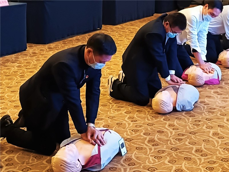 学以致用,巩固认知。通过培训讲师的引导,在场员工顺利实现应急救护理论与技能实操的联动。强运动量的力竭、十指紧扣的胀痛丝毫未能阻挡全员积极参与心肺复苏术实操。跟随节拍器的按压节奏,从伊始的“眼神聚焦位置错误”“手臂发力部位不当”“未使人体模具腹部有效隆起”到满分学员大量涌现,实践热情度不断高涨,技能掌握度显著提升,为“危难时刻,我有准备”奠基。