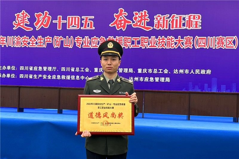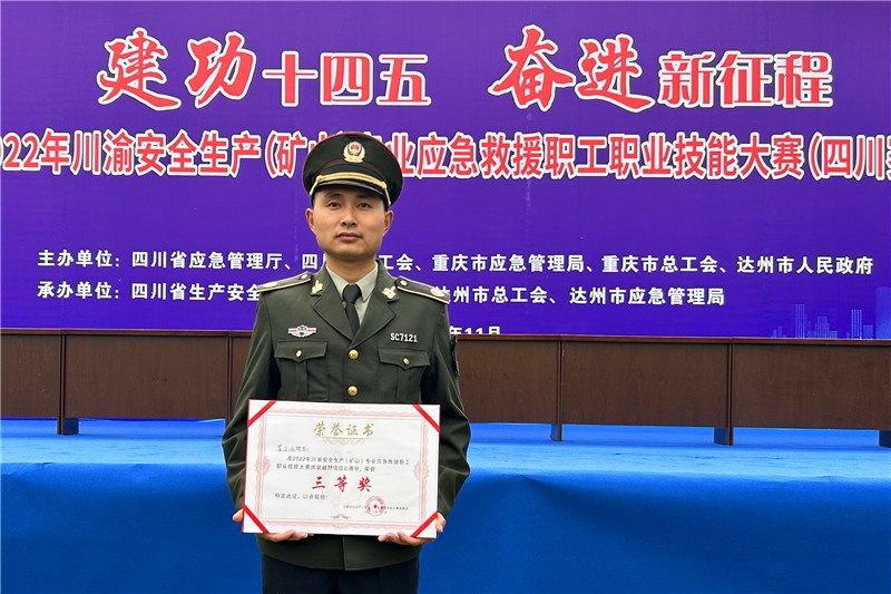 11月23日至24日,川渝安全生产(矿山)专业应急救援职工职业技能大赛在四川省达州市举行,嘉阳集团矿山救护队参赛队员贺文冰荣获武装越野项目三等奖。