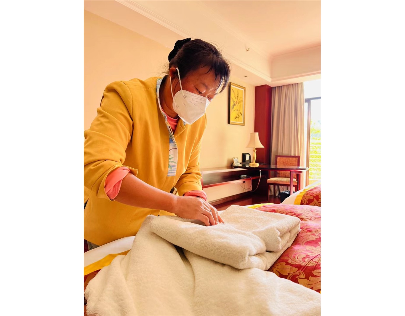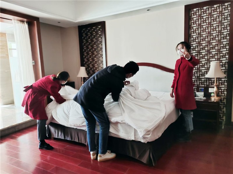 12月16日酒店又迎来大批客人入住,为确保新到店客人能及时、顺利入住,酒店一百多间退房急需在当日中午13点前全部完成清扫、消杀工作。因大部分客人退房集中在11点左右,且已有部分客人抗原阳性,面临人员缺、时间紧、任务重的挑战,酒店立即组织帮扶调度会,酒店驻店总经理带队全体员工深入一线作业,在有序分工安排后,各自奔赴“战场”争分夺秒、积极抢房。仅在两个小时内便完成房间清扫、室内整理、消杀换洗和入房引领工作,保证当日两百多名客人顺利入住。