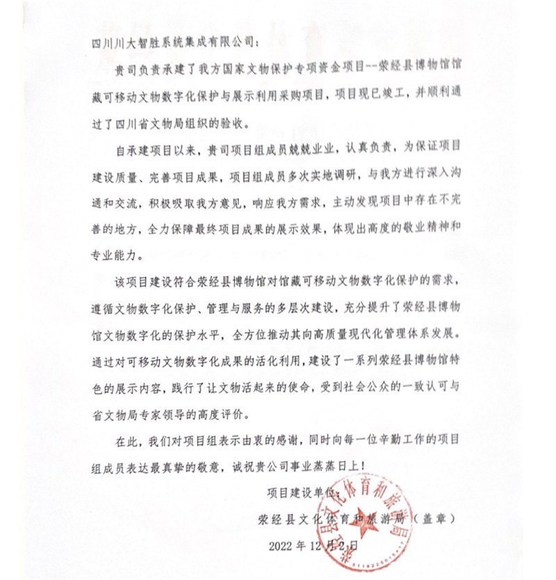 近日,由川投信产所属智胜集成承建的国家文物保护专项资金项目——荥经县博物馆馆藏可移动文物数字化保护与展示利用采购项目顺利通过了四川省文物局组织的验收。荥经县文化体育和旅游局特别发来表扬信,对项目成果给予了高度肯定,向项目组成员的专业能力和敬业精神表示了敬意。