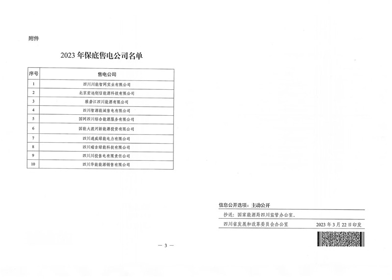 3月22日,四川省发展和改革委员会、四川省能源局印发了《关于明确四川电力市场2023年保底售电公司的通知》(川发改能源〔2023〕132号),四川川投售电有限责任公司被评定为四川电力市场2023年保底售电公司。