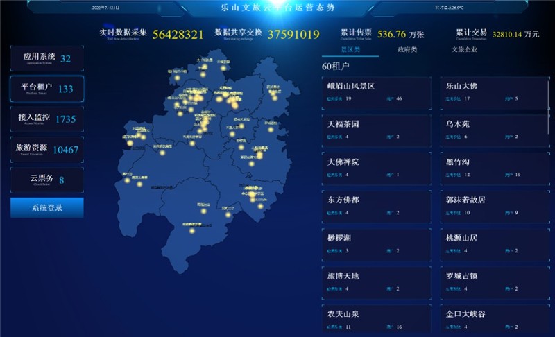 乐山市多个县(市、区)通过智胜慧旅“文旅行业云”搭建了乐山市文旅指挥调度中心和“一部手机游乐山”的全域文旅大数据公共服务平台,实现对全域多维度产业监测和行业监管,同时在境内国家4A级以上旅游景区初步实现市、县、景区三级联动指挥调度中心的智慧化管理、数据化共享。立足“全域”发展理念,乐山市通过“文旅行业云”完成了全市全域智慧文旅各业务管理系统间数据的共享和交换,并规范了数据资源的共享、交换和管理机制,实现异构应用之间的数据动态同步和交换,助力旅游景区当地区域经济发展提质。该案例于2021年被国家文旅部评为全国智慧旅游典型案例。