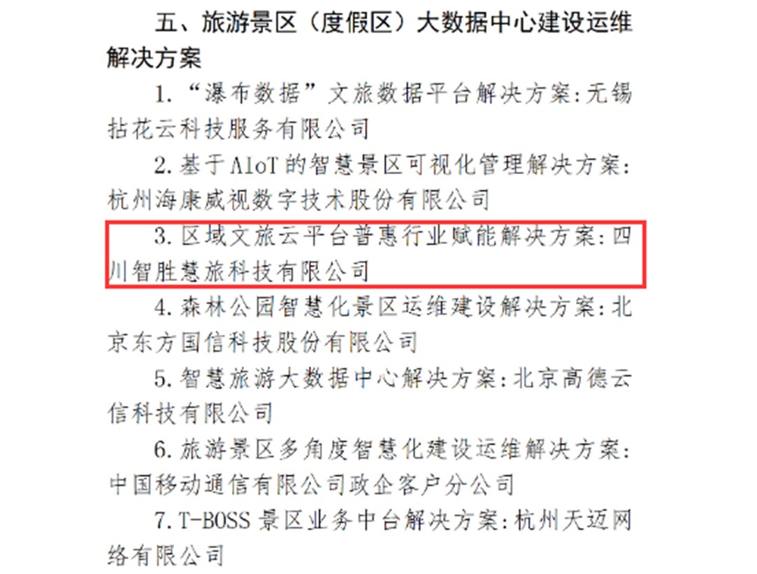 自收到各地文旅景区发来的“五一迎峰保运营”相关感谢信后,近日,川投信产所属智胜集成子公司智胜慧旅提报的“区域文旅云平台普惠行业赋能解决方案”又成功入选智慧旅游“上云用数赋智”解决方案首批提名名单。