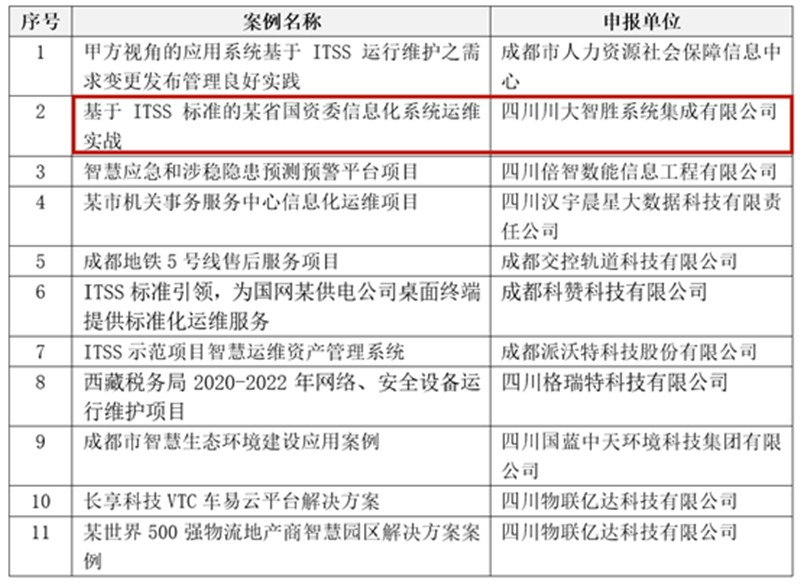 日前,成都市工业互联网发展中心联合四川省软件行业协会开展征集ITSS(信息技术服务标准)优秀应用案例工作,并于2023年12月评选出11个优秀案例。公司所属智胜集成申报的“基于 ITSS 标准的某省国资委信息化系统运维实战”案例成功入选。