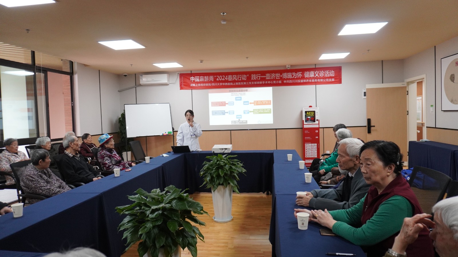 随后,医护人员们围绕高血压、骨质疏松、跌倒风险等老年群体常见疾病进行健康讲座。讲座中,各位长者积极分享自身防治经验,并与医生护士们进行沟通交流。一堂健康讲座,不仅为长者带来了医生们专业的诊疗及防治建议,也加深了长者们健康养老的思想意识。讲座中,医护人员们还为机构工作人员详细讲解了AED使用和心肺复苏操作规范,提升了养老机构突发应急处置的专业性和规范性。
