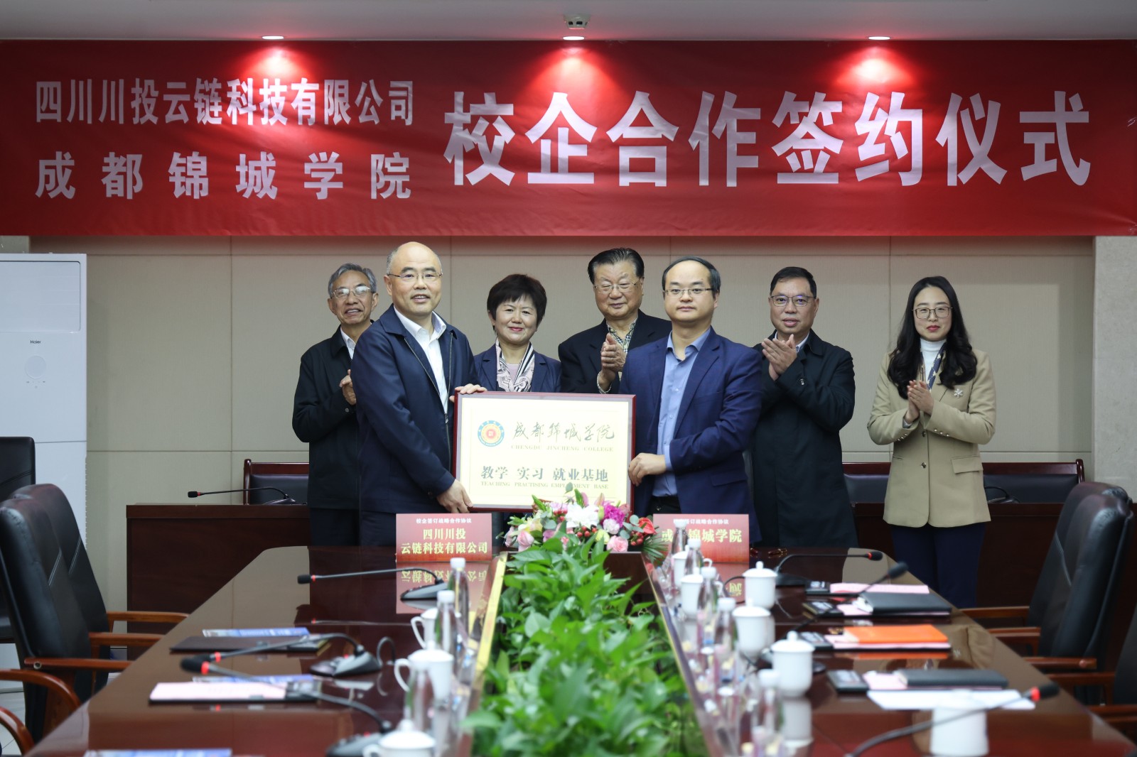 在双方领导及嘉宾的共同见证下,川投云链和锦城学院正式签约。同时,锦城学院为川投云链授予“教学 实习 就业基地”牌匾,正式开启校企协同育人新篇章。