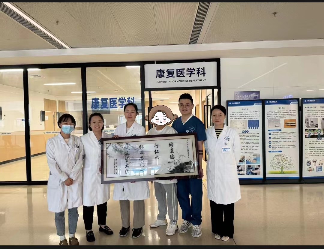 褚女士(化名)脑卒中后右侧偏瘫两年零三个月,辗转求医未果,其儿子随之抑郁。两人在康复医学科接受治疗后,褚女士的肢体功能得到了很大的提升,儿子性格也日渐开朗,特意订做了一副画相赠。