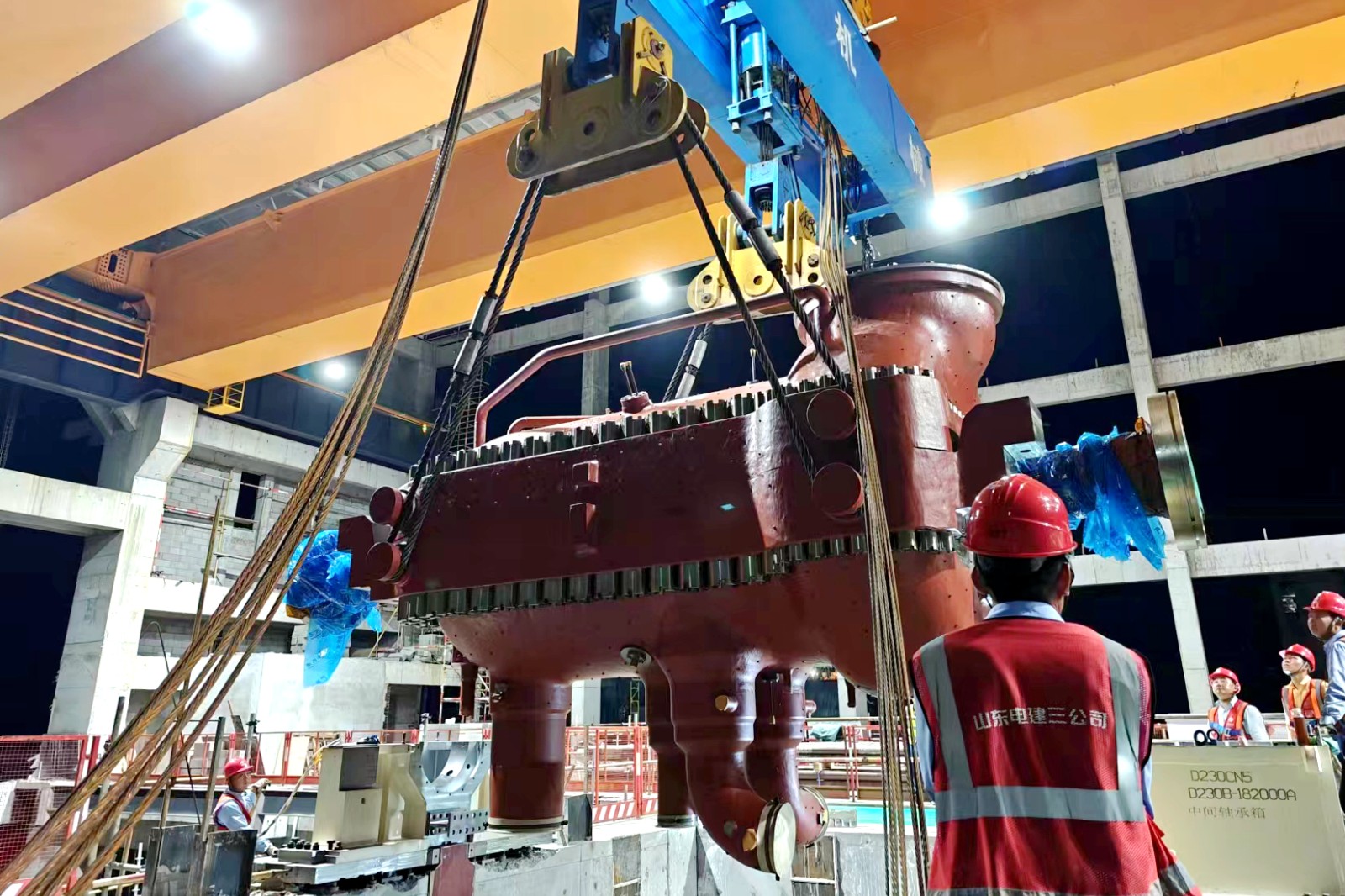 项目汽轮机部分高中压缸采用模块化设计,长8.9米、宽3.7米、高4.5米,重170吨,现场采用两台行车和液压提升装置联合吊装方式进行吊装。