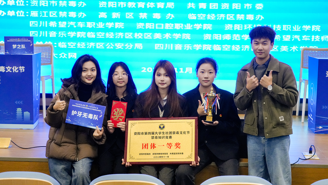 11月27日,由资阳市禁毒办、资阳市教育体育局、共青团资阳市委联合主办的资阳市第四届大学生社团禁毒文化节知识竞赛落下帷幕。现场来自六所学校的6支参赛队伍激烈角逐,资阳口腔职业学院医学系学生莫麟莉、护理系学生李维希、智能医学工程系学生王怡灵组成的“护牙无毒队”以680分总分第一的成绩荣获第一名!