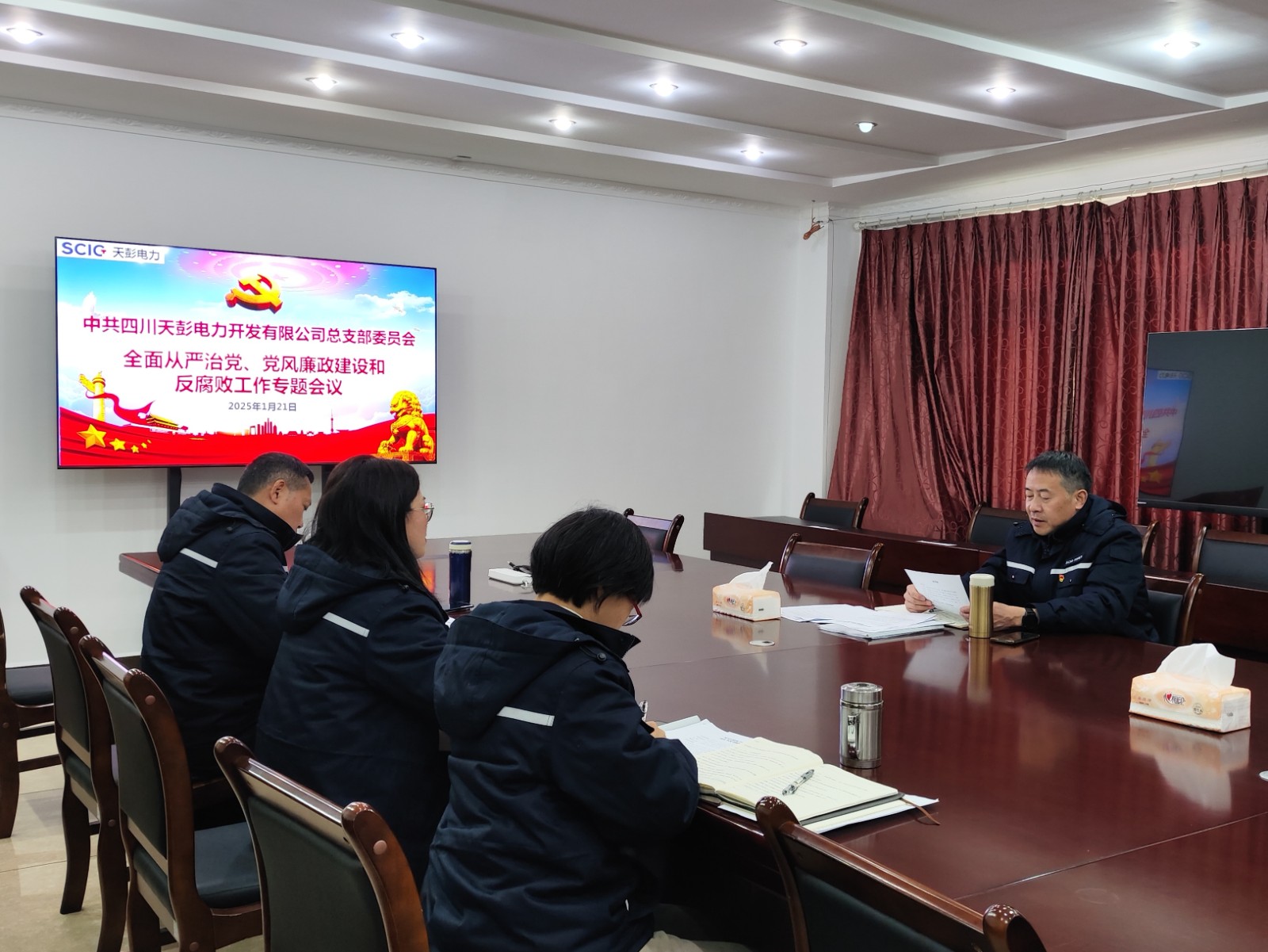 为深入贯彻全面从严治党要求,持续强化党风廉政建设,推动反腐败各项工作落实落地,近日,川投能源所属天彭电力党总支召开年度全面从严治党、党风廉政建设和反腐败工作专题会,公司领导班子成员参会,会议由天彭电力公司党总支书记、执行董事、总经理刘红兵主持。