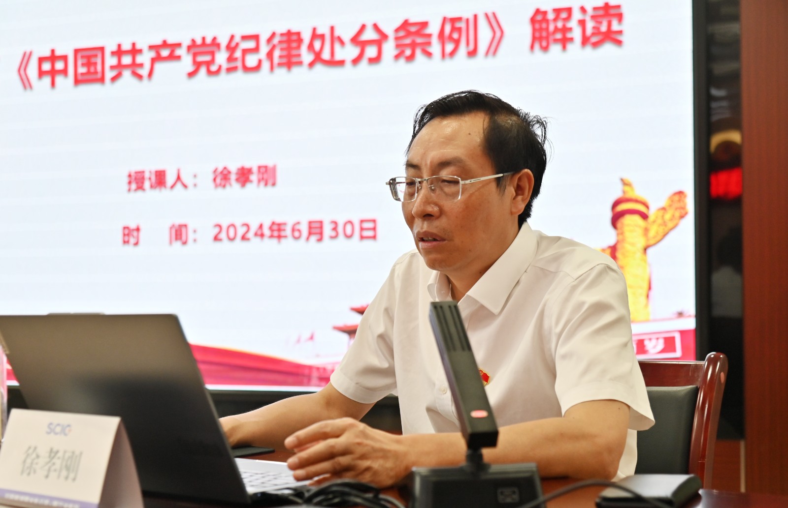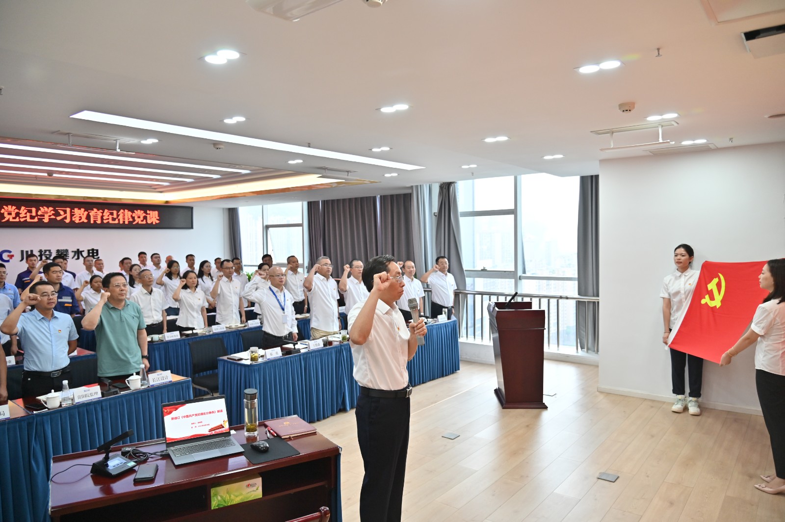 在全党开展党纪学习教育和党的103岁生日来临之际,按照川投能源党委和攀水电党总支的安排部署,6月30日上午,川投能源副总经理、攀水电公司党总支书记、董事长徐孝刚讲授了党纪学习教育纪律党课并宣讲省委十二届五次全会精神,公司全体员工、参建单位负责人及党员代表共计50余人参加。